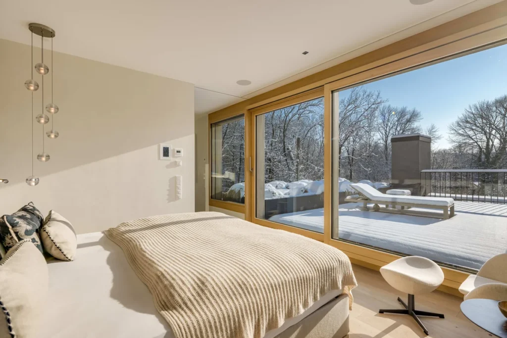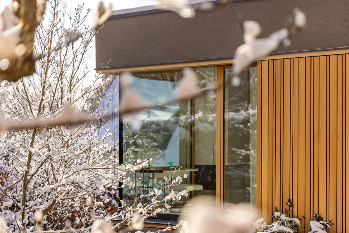 A clear, modern design language, a luxurious interior design with precious natural materials and a successful, family-friendly spatial concept characterize this absolutely top-class property. The façade lives from the effective interplay of large-format glass fronts and closed surfaces; vertical oak elements establish the connection to the idyllic, natural location. A cantilever lends lightness and a floating effect to the cubically inspired structure.